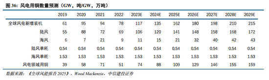 风力发电主要用铜环节为发电机、变压器、电缆、齿轮箱和塔筒电缆等。陆上风机通过集电器电缆相连至变电站后,再连接到电气和输电网。海上风机通过集电器电缆相连至海上升压站后,通过配电电缆连接至地面变压站,再到输电网络。据Wood Mackenzie数据显示,陆上风电每GW装机需要耗铜0.54万吨,海上风电每GW装机需要耗铜1.53万吨。根据全球风能理事会(GWEC)发布的《2025全球风能报告》,风电行业需将其年新增装机从2023年的117GW提高到2030年的至少215GW,据此测算,2025年全球风电领域用铜数量达109万吨,占全球铜消费的3.3%。鉴于风电仍保持增长,预计2025-2028年风电领域用铜增长分别为19万吨、9万吨、12万吨、5万吨。