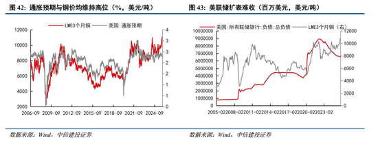 从与铜价密切相关的通胀预期、美联储负债与美国基准利率看,特朗普关税政策令通胀预期维持在高位,而美联储对2020年释放的天量流动性回收有限,当前美国正处于利率下行周期中,宽裕的流动性及弱美元环境,非常有利于以美元计价且资源稀缺的铜得到高溢价。结合供需及宏观环境,预计2025~2028年LME铜价重心逐级上移到9800美元/吨、10600美元/吨、11200美元/吨、11840美元/吨。