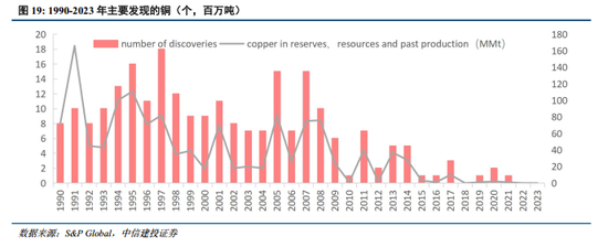 发现矿山数量少,潜在的可供开发项目数量有限。根据S&P Global Commodity Insights 2024年度更新报告,确定了1990年至2023年发现的239个铜矿矿床,过去2014-2023十年的新发现仅占14个,占总数的5.9%。239个铜矿合计的储量、资源量和过去的累计生产量共计13.15亿吨铜,这一数量较去年增加了4%,即6100万吨。但是,其中大部分增长是由于较旧发现的矿床的扩张,1990年代发现的矿床占总增长的70%,即4300万吨。过去十年新发现的14个铜矿所含体积仅占自1990年以来主要发现的所有铜的4620万吨,即3.5%。由于新资产自然需要更多时间来开发,因此这一数量在未来几年内可能会增加,从而有资格成为重大发现。然而,最近的发现在规模或数量上肯定无法与1990年代相提并论,换而言之,未来供铜矿商备选开发的项目有限。