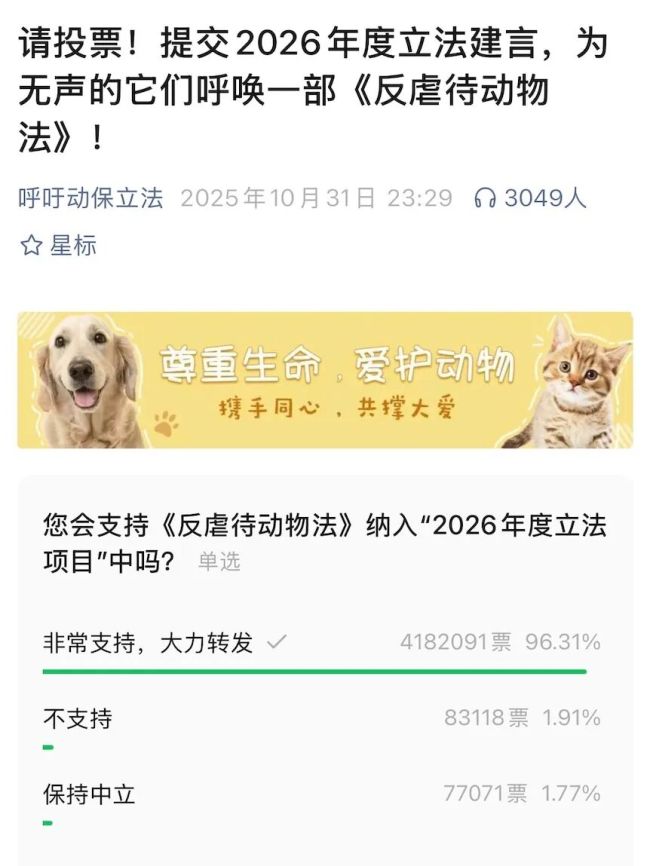 今年11月,一项关于制定《反虐待动物法》的线上投票在微信平台上获得近420万支持,反映出该议题的社会关注度不断提升。