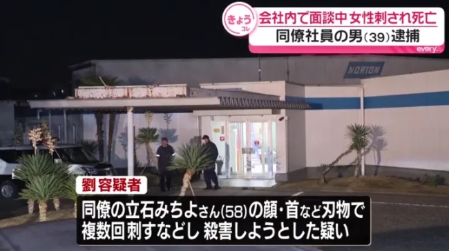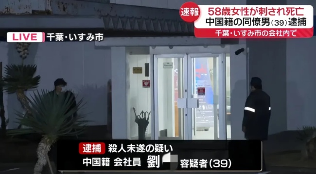 当地时间12 月 5 日上午 9 点多, 日本千叶县伊隅市突发命案。39 岁中国籍男子刘某在工作的 玻璃制品制造公司拿出从家里带来的刀,刺死了 一58 岁的日本籍女同事 立石美智子 。