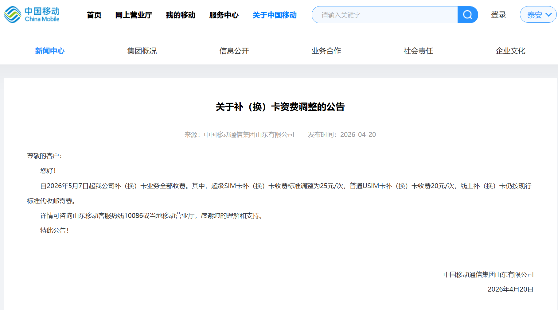 此前,中国移动已在山西、河南等省份实施补换卡收费政策,而北京、上海、福建等地区暂未发布同类调整公告。