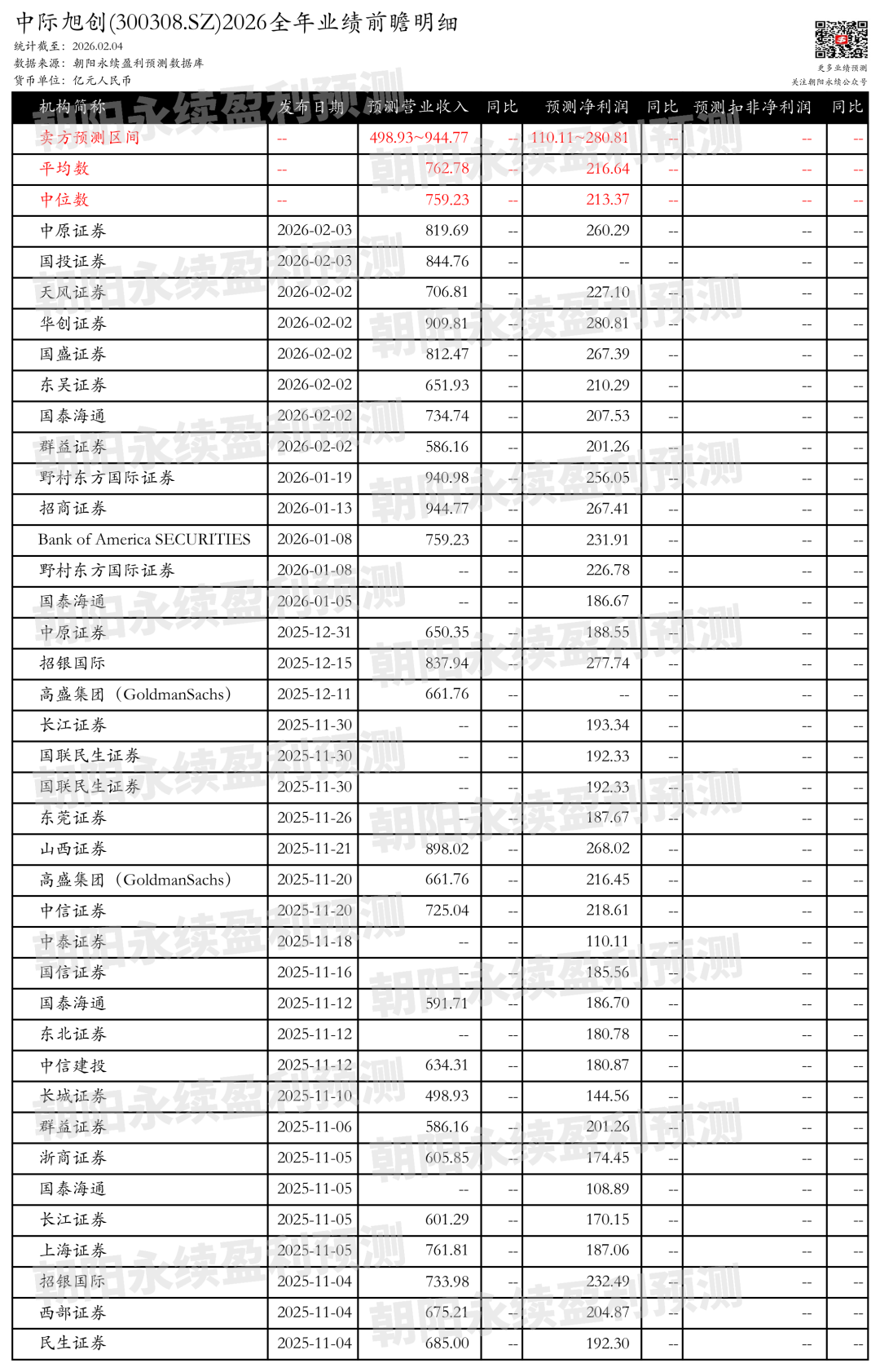 截至2026年02月04日,根据朝阳永续季度业绩前瞻数据: