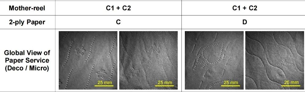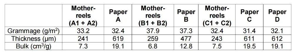 这里有必要对表格数据进行一下说明,Mother reels(A1+A2)表示的是没有经过压花工艺处理的 A1、A2 两层纸叠在一起的对照组。