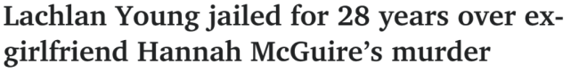 23 岁建筑工人 Lachlan Young 因谋杀前女友 Hannah McGuire,被法院判处 28 年监禁。案发于去年 4 月 5 日凌晨。Young 在与 McGuire 分手后,于两人曾同住的住所内与她发生争吵,并将其勒杀。此后,他在一名未被指控不当行为的朋友协助下,将 McGuire 的遗体放进她自己的车,开往偏僻灌木丛并焚烧车辆,企图伪造成自杀现场。他还向 McGuire 的母亲 Debbie McGuire 发送伪造短信试图误导调查。