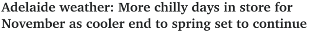 原文:https://www.adelaidenow.com.au/news/south-australia/adelaide-weather-more-chilly-days-in-store-for-november-as-cooler-end-to-spring-set-to-continue/news-story/5269dc9109973a44cf974d408f3b1d69