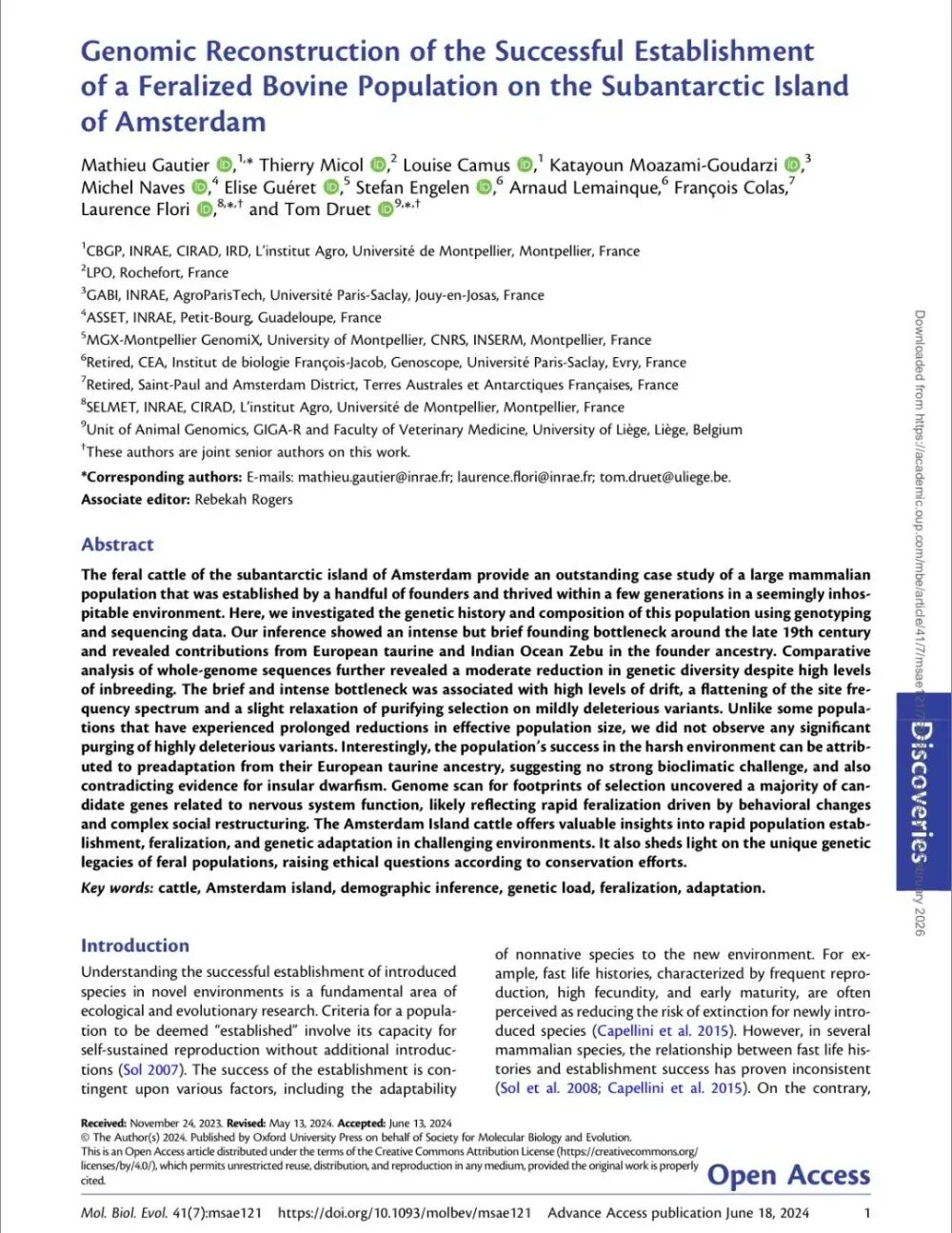 前面提到的研究,实际上是这次“栖息地恢复计划”的一个副产品。通过这项研究,人们终于弄清楚了这群牛的“前传”,但它们也已经不可能再有“未来”了。今天,阿姆斯特丹岛牛群的存在,被压缩成了存储在冷冰冰的服务器里的 ATCG 碱基序列,以及《MBE》期刊上那一簇簇复杂的数据散点图。它们如同划过南印度洋夜空的一颗流星,用自己的基因谱写了一曲关于生存、偶然与毁灭的壮丽悲歌。它们冷酷地向人类证明了生命在极端环境下的韧性,却也无奈地宣告,在“人类世”的法则里,即便你赢得了进化的赌局,也终究敌不过人类扣下扳机的那一根手指。