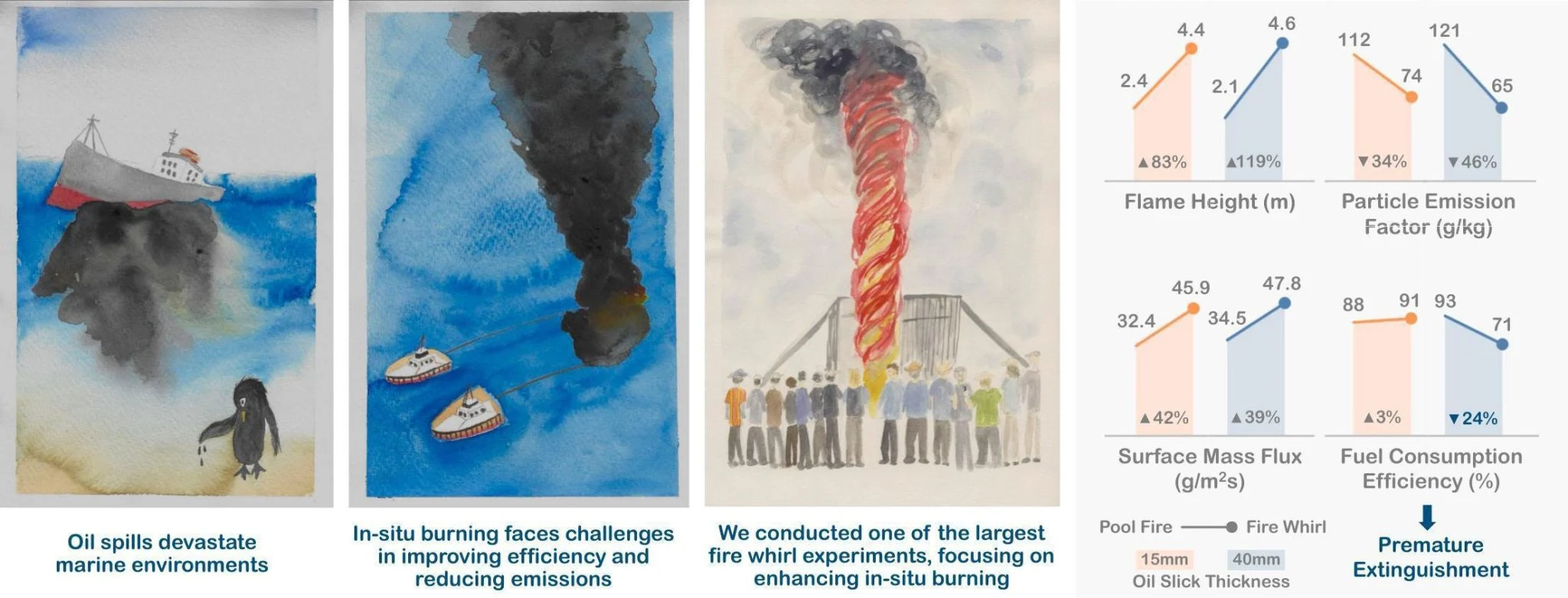 与常规就地燃烧形成的“火池”相比,火龙卷通过强烈旋转将大量氧气卷入火焰,使燃烧温度更高、反应更充分。 实验结果表明,在相同条件下,火龙卷的燃烧速度提高约40%,几乎可燃尽95%的油料,留下的有害颗粒物和有毒残余显著减少。 同时,烟尘排放也减少约40%,意味着应急燃烧对空气质量的影响得到明显缓解。