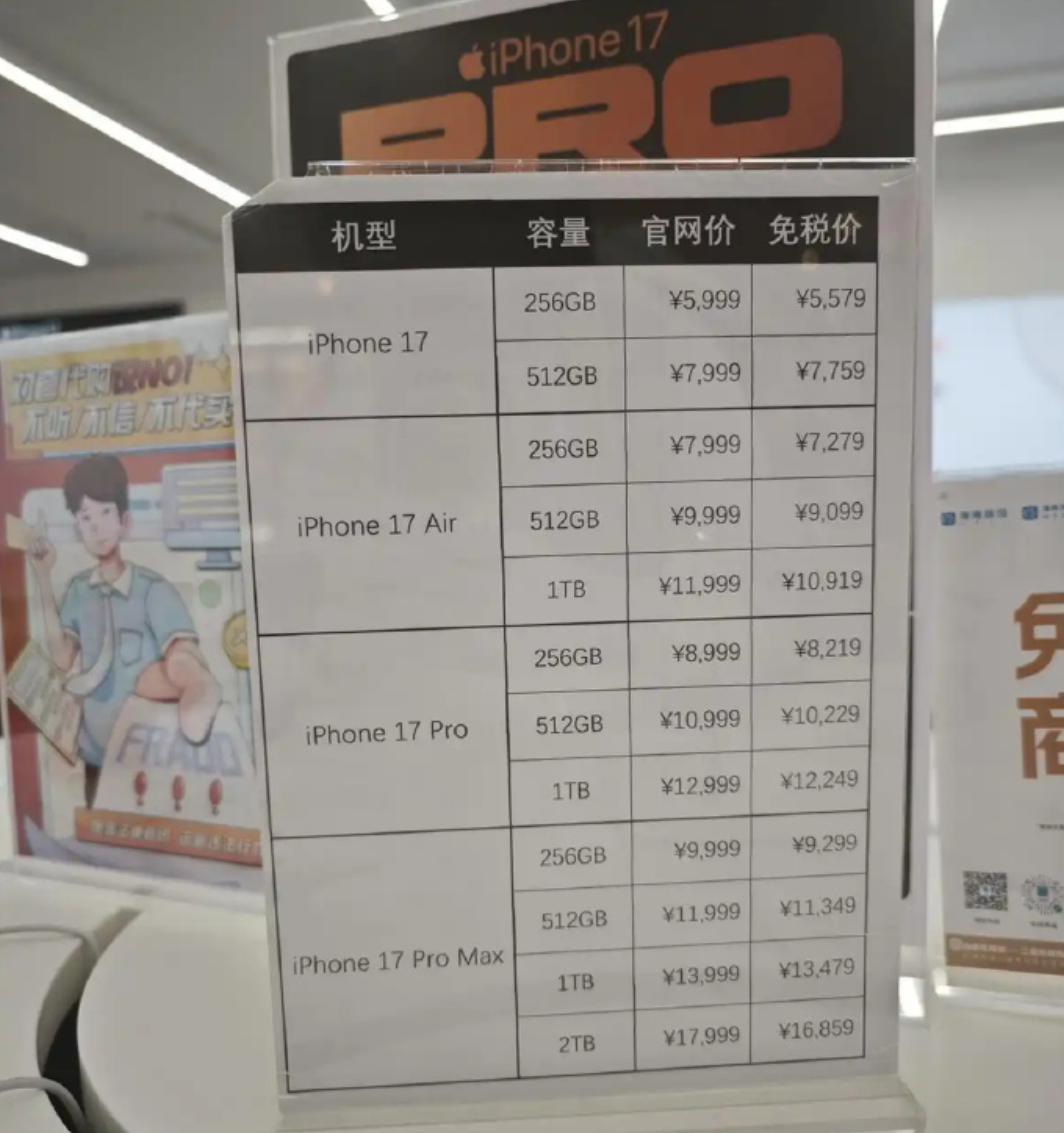 iPhone 17 Pro 256GB版本免税价为8299元,电商平台苹果旗舰店同款售价是8999元,也相差700元。