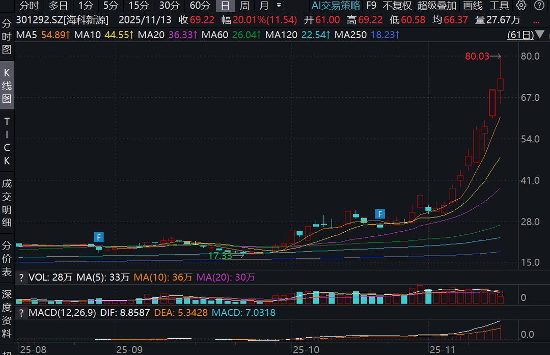 11月13日,海科新源盘中实现“20cm”涨停。截至当日收盘,海科新源未能打开涨停板,报收于69.22元/股,全天换手率32.53%,成交量27.67万手。至此,该股已连续8个交易日(11月4日至13日)上涨,区间涨幅超100%。