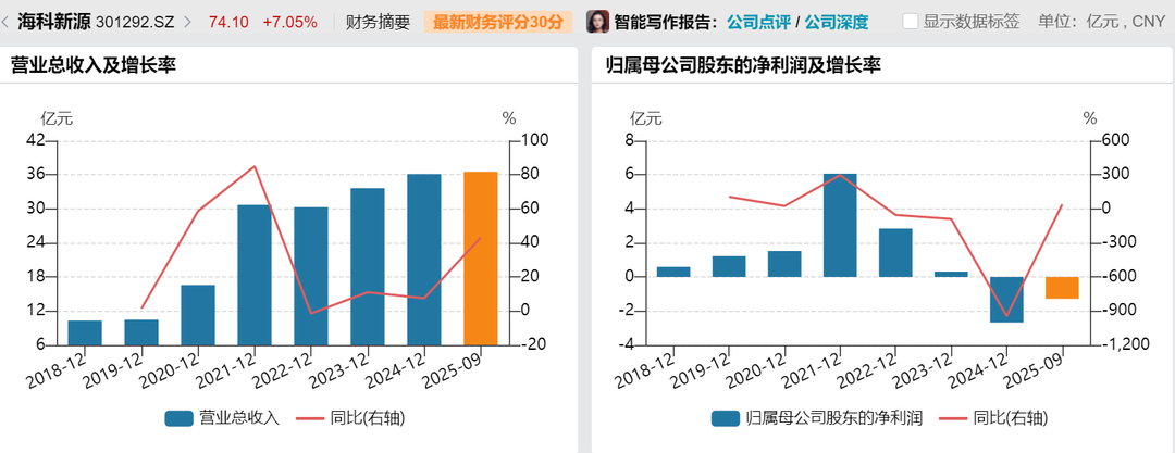 据海科新源2024年年报,报告期内营业收入为36.15亿元,同比增长7.49%;归母净利润为-2.67亿元,同比下降944.35%。海科新源在年报中表示,业绩亏损主要有三方面原因。