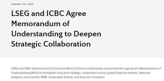 伦敦证交所集团(LSEG)1月30日宣布同中国工商银行签署谅解备忘录,加强在全球金融市场、数据和分析、跨境人民币、可持续金融和金融创新领域的长期战略合作。