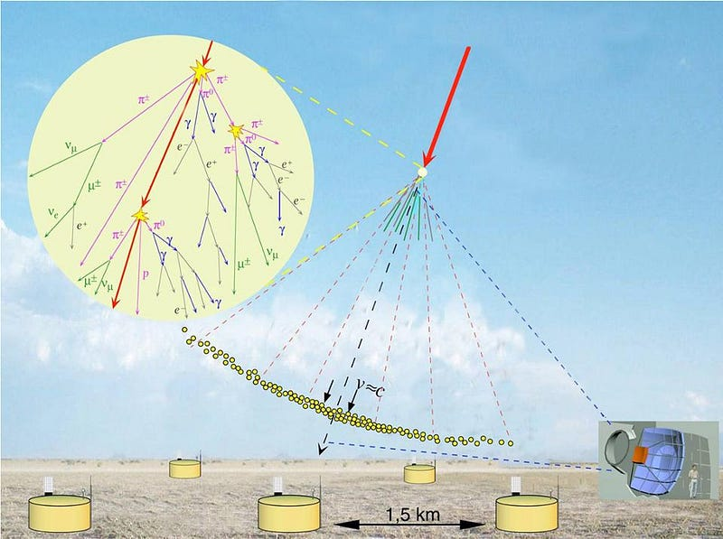 首先射线里的粒子得穿过大层,和空气中的粒子各种交锋碰撞,碰撞的结果就是层层炸开,产生级联反应,形成像大喇叭一样的空气簇射。