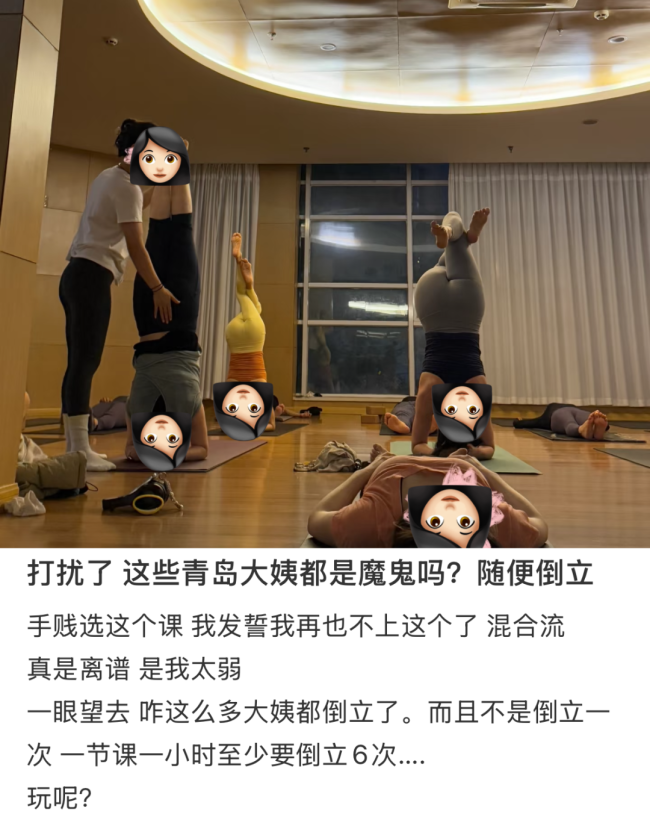青岛的瑜伽馆,认准一点就行,有没有能倒立劈叉的大姨。有,说明这家店专业,不搞虚的。