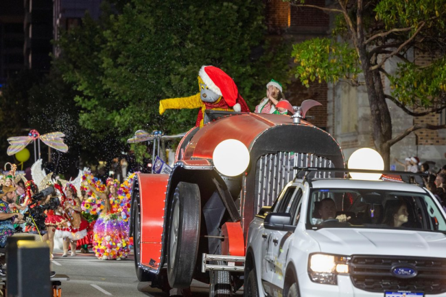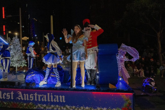 The West Australian的花车继续将气氛推向高点:Newsworthy播客主持人兼影评人Ben O’Shea化身胡桃夹子,而Santa的精灵们则在车上忙着将信件“寄往北极”。