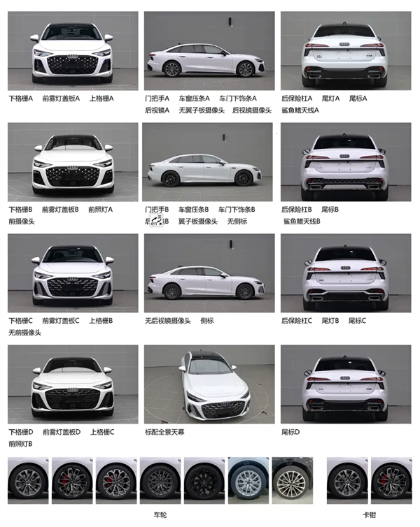 从新车申报照片来看,全新一代奥迪A6L外观风格大变,除了标志性的大嘴进气格栅变动不多外,车辆大灯、前脸造型、门把手、尾灯、后保等位置,都采用了全新设计。
