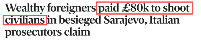 米兰检察机关正式对多名意大利公民展开调查,这些人被指控在1990年代波黑战争期间,支付高达8.8万英镑(约98万人民币)的费用,前往萨拉热窝附近高地狙击平民,只为“感受杀戮快感”!