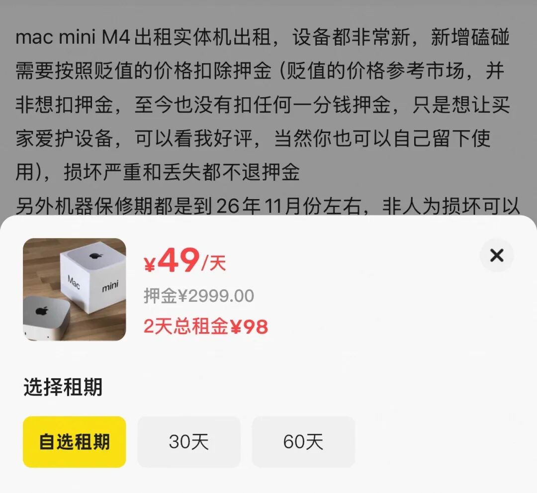与此同时,二手交易平台上涌现出不少Mac mini租赁商家。一名商家表示,M4芯片的Mac mini目前的租金为49元/天、399元/月。此外,也有商家提供远程租赁搭载OpenClaw的Mac mini服务,用户通过远程软件连接使用,租金为10-20元/天不等。