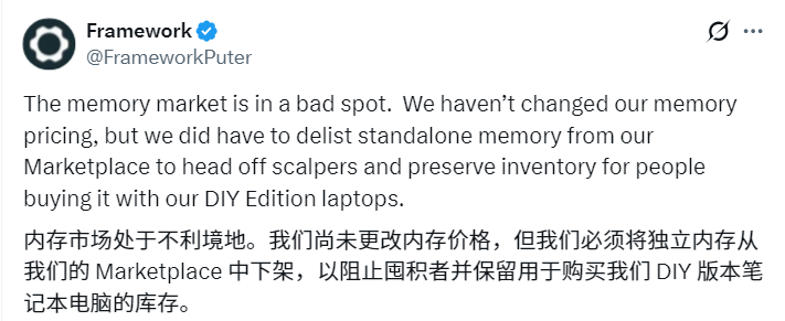 Framework表示:“内存市场状况不佳。我们没有改变内存定价,但不得不将独立内存从我们的商城下架,以阻止黄牛,并为购买我们 DIY 版笔记本的用户保留库存。”