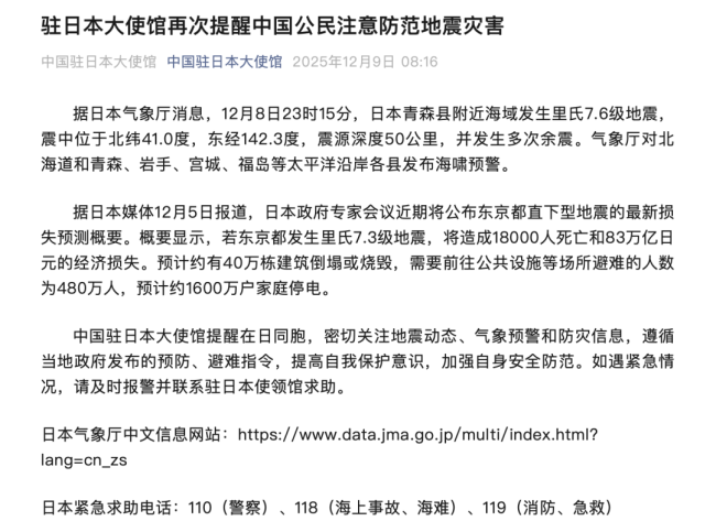 对此,中国驻日本大使馆9日凌晨发布领事提醒: