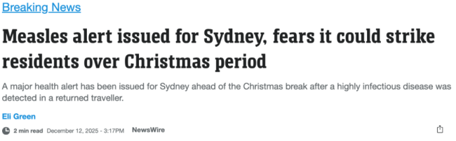 悉尼居民被提醒在圣诞节期间留意麻疹症状,因为在过去九天内,这名患者在社区内具有传染性。
