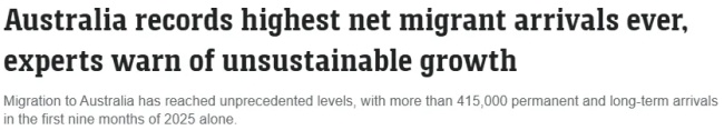 根据最新官方统计,2025 年前三季度,澳洲净长期与永久移民数量突破 41.5 万人;过去十二个月更逼近 47 万人,创下有记录以来的最高纪录。 这意味着,澳洲每一分钟就有一名新移民落地。