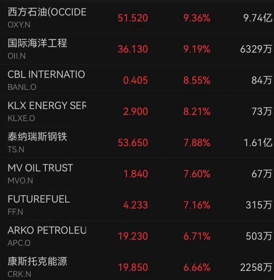受中东局势等因素影响,国际油价近日上涨。NYMEX WTI原油期货报收于66美元/桶上方。能源股板块走高,西方石油、国际海洋工程涨超9%。