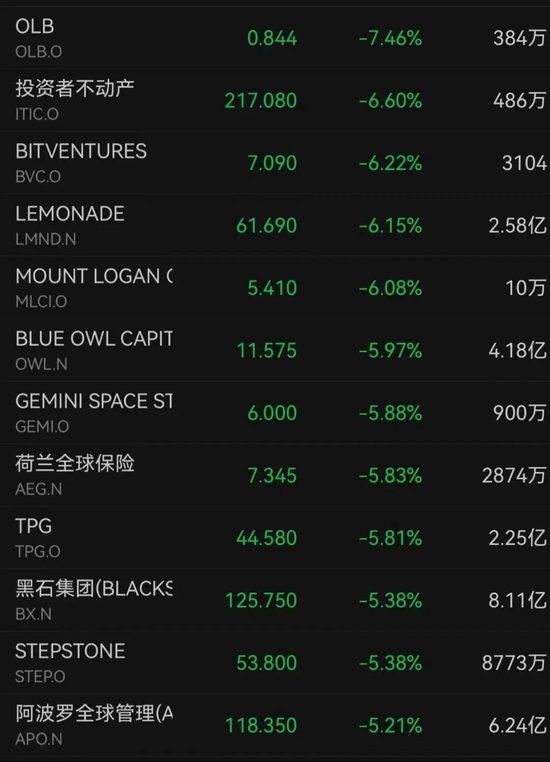 资产管理公司集体承压。Blue Owl Capital下跌近6%,荷兰全球保险、黑石集团、阿波罗全球管理分别下跌5.83%、5.38%、5.21%。