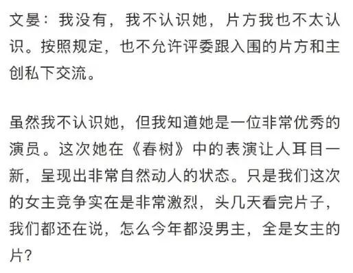 但网友很快扒出破绽:文晏曾与《春树》导演张律共同担任上海电影节评委,她的《想飞的女孩》由上海影视公司出品,该公司高管与张律更是长期合作伙伴。这些关联让她的“不熟”说辞显得苍白无力。