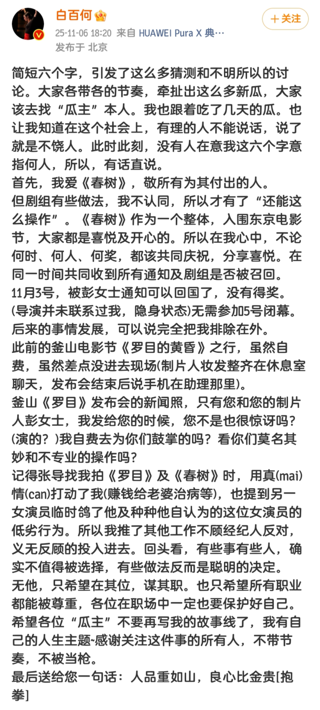 这条信息量稀薄的动态瞬间点燃瓜圈——彼时《春树》正处于评奖关键期,作为片中绝对大女主的白百何,这番表态很难不让人与奖项归属产生联想。
