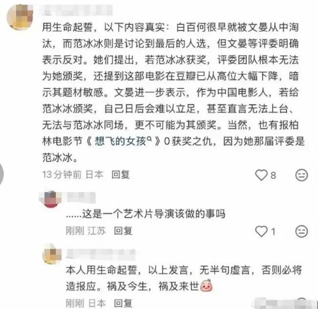 至于原因,除了范冰冰的税务污点与影片题材敏感,更有“私怨”的说法——今年2月柏林电影节上,文晏带着《想飞的女孩》参赛,而担任评委的范冰冰未能为其争取奖项,此次东京之行被解读为文晏的“报复”。范冰冰的大粉更是直接发文怒斥,称“资深电影节被内娱三无导演拉帮结派玷污”。