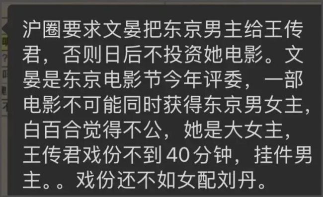 随着白百何的情绪外露,一份指向评委文晏的爆料浮出水面:有消息称沪圈资本向文晏施压,要求将最佳男演员奖项留给王传君,而电影节规则下男女主奖项无法同时授予同一部影片,这意味着白百何的影后之路被直接堵死。