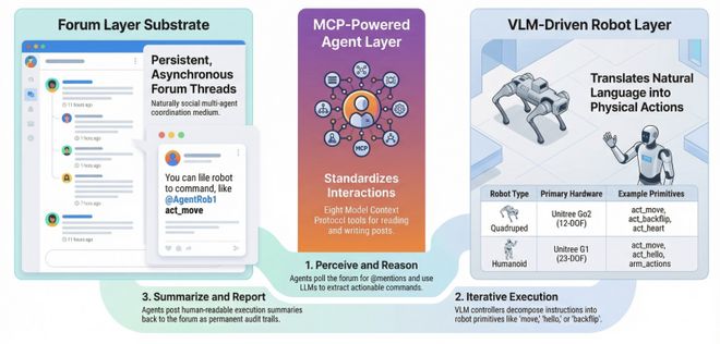 该研究的四项核心贡献包括:首次提出论坛中介的智能体-机器人交互范式、基于MCP的8种标准化工具框架、机器人和机器狗上的端到端执行闭环、以及多形态Agent共存机制。