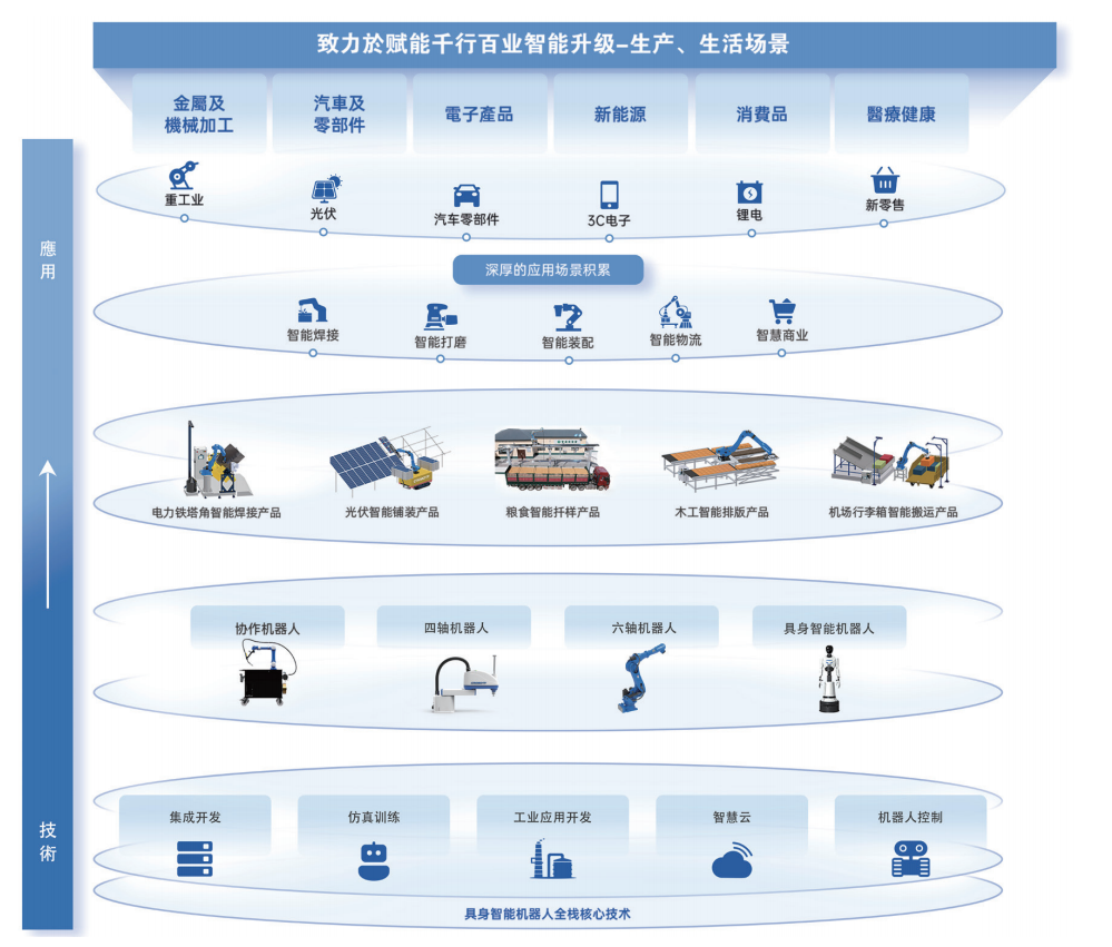 公司是中国先进的工业机器人公司,也是具身智能机器人的先锋。依托全栈自主核心技术与多场景智能应用能力,成功构建了主要涵盖工业机器人、协作机器人、具身智能机器人的三大类全自主研发产品矩阵。
