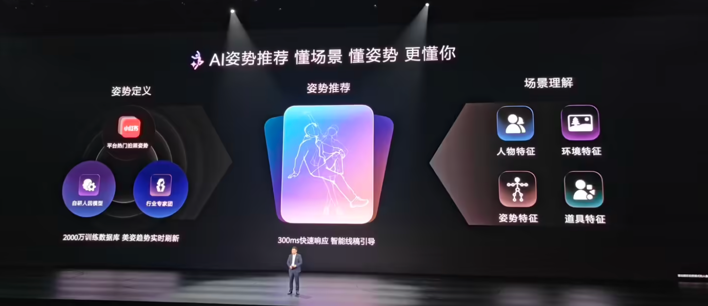 发布会上,华为还推出全新XMAGE智拍功能。支持AI姿势推荐、AI辅助构图、3D动态照片、人像精修、XMAGE风格、一键成片等功能。其中,AI姿势推荐结合平台热门拍照姿势、自研人因模型、行业专家团,2000 万训练数据库,美姿趋势实时刷新。该功能实现300ms快速响应、智能线稿引导,支持人物特征、环境特征、姿势特征、道具特征等场景理解。