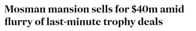 澳媒报道,悉尼Mosman一栋豪宅近期以约4000万澳元的价格售出。