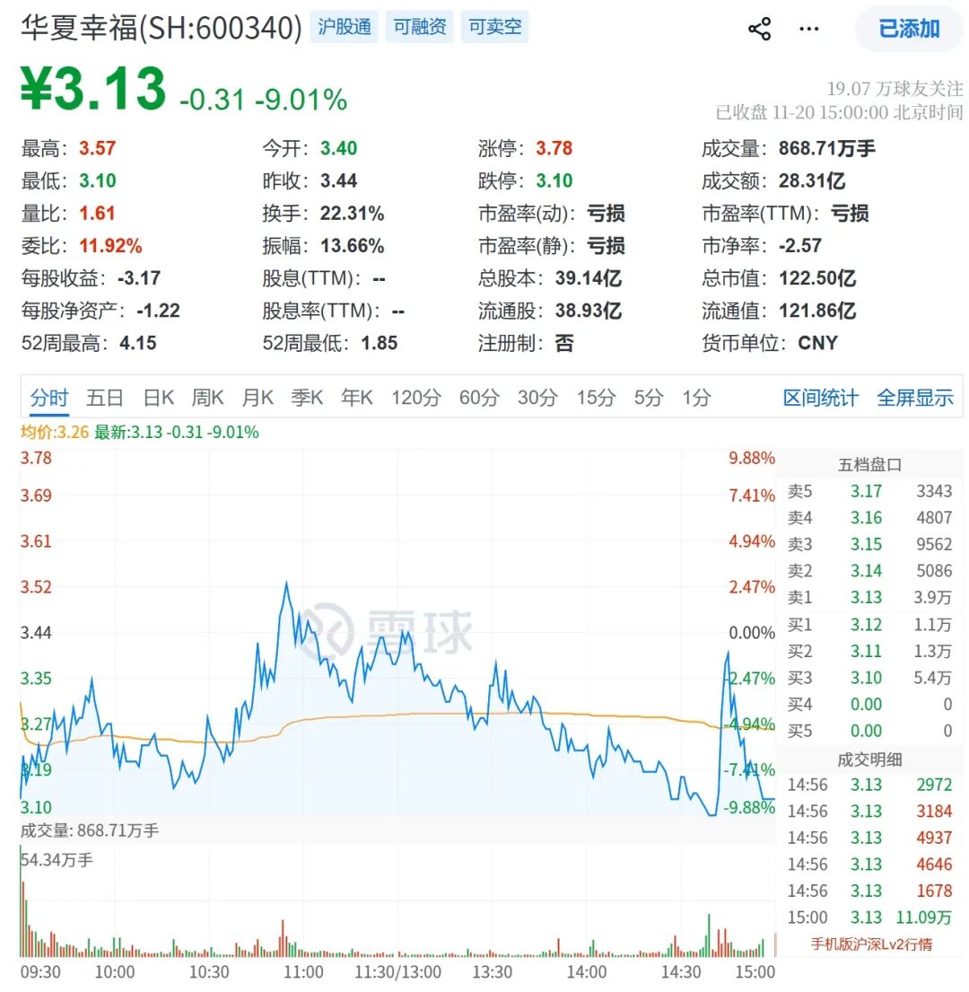 截至发稿,华夏幸福尚未有官方回应;11月20日收盘,公司股价暴跌9%。