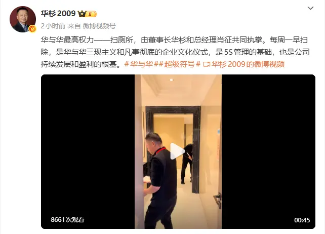 12月29日,华与华董事长华杉发布视频称,其公司最高权力为“扫厕所”,由他本人与总经理肖征共同执掌,并作为每周一早扫除的企业文化仪式。