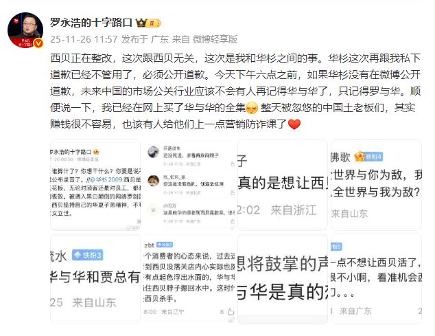 罗永浩随后又发文称,“华杉这次再跟我私下道歉已经不管用了,必须公开道歉。今天下午六点之前,如果华杉没有在微博公开道歉,未来中国的市场公关行业应该不会有人再记得华与华了,只记得罗与华。”