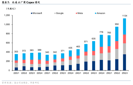 北美云厂商Capex持续扩张,25Q3环比提速,全年指引上修。CY2025Q3资本开支合计1134亿美元,同比+78.42%,环比+19.31%。CY2025Q3 Microsoft/Google/Meta/Amazon 的资本开支分别为349、240、194、351亿美元,同比+75%/+84%/+111%/+65%,环比+44%/+7%/+14%/+12%。从各厂商表述来看,呈现出几个共同特点,1)指引持续上修,例如微软表示2026年资本开支增速将高于2025年;2)2026年需求强劲,Google、微软、亚马逊均表示2026年云业务将持续处于供不应求的状态;3)数据中心建设加速,微软与亚马逊表示未来两年内将数据中心规模扩大一倍。