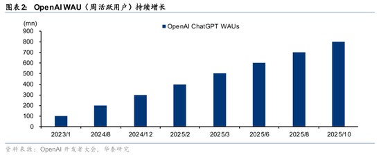 1、应用新范式推动推理算力需求持续扩张。AI时代的推理需求由三个变量决定:用户数量x用户使用时长x用户使用深度。AI时代的推理需求正从用户侧、模型侧与任务形态端全方位扩张。用户数量方面,AI应用渗透提速,OpenAI月活跃用户突破8亿,AI工具正演变为新型基础应用;使用深度方面,模型从通用问答向Reasoning Model、Deep Research与Agent等复合智能体演进,复杂推理调用频次显著提升;使用时长方面,AI正在从“被动响应”走向“主动运行”,OpenAI Pulse等产品实现闲时推理与持续学习,使AI进入“常开推理”阶段,显著拉升算力利用率。我们认为,三大变量共振推动推理强度与频次同步提升,构成AI基础设施需求的核心增长引擎。