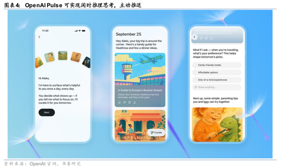 3)从使用时长的角度看,AI正在从“被动响应”向“主动运行”转变,推理时间被大幅延展。OpenAI新推出的Pulse产品允许模型在用户闲置期间自动搜集资料、整理知识与进行离线学习,实现了计算时长的持续积累。这意味着AI不再只在用户输入时触发计算,而是进入“常开推理”状态,大幅拉升算力利用率。随着更多实时生成、连续学习及多模态交互类应用(如视频生成、虚拟助理、AI Companion)的普及,未来AI推理将从“短时任务型”向“长时运行型”转变,计算需求有望迎来数量级增长。我们认为,推理侧的高速增长正从用户端、模型端、任务形态端全方位驱动算力扩张,形成AI基础设施需求的长期成长主线。