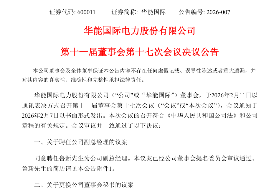 公告披露,华能国际董事会于2026年2月11日召开第十一届董事会第十七次会议,审议通过关于聘任公司副总经理的议案及关于更换公司董事会秘书的议案,同意聘任鲁新先生为公司副总经理,聘任文明刚先生为公司董事会秘书。本议案已经公司董事会提名委员会审议通过。