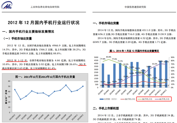 2012 年 3G 手机出货量是 2.65 亿部,比去年同期增长了 81.4%,到了 2014 年,3G 手机下滑,4G 手机销量暴涨。