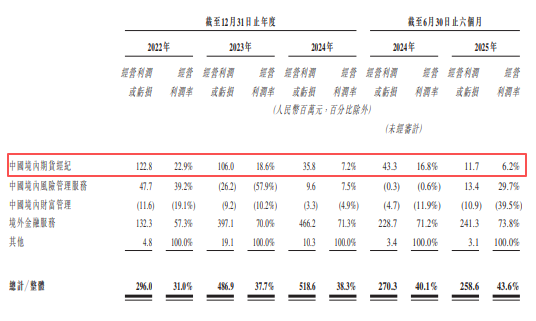 拆分收入来看,2022年、2023年、2024年、2025年上半年,南华期货在中国境内期货经纪业务实现收入5.36亿元、5.71亿元、4.94亿元和1.9亿元,实现经营利润分别为1.23亿元、1.06亿元、0.36亿元和0.12亿元,经营利润率分别为22.9%、18.6%、7.2%和6.2%,近年来有下滑趋势。