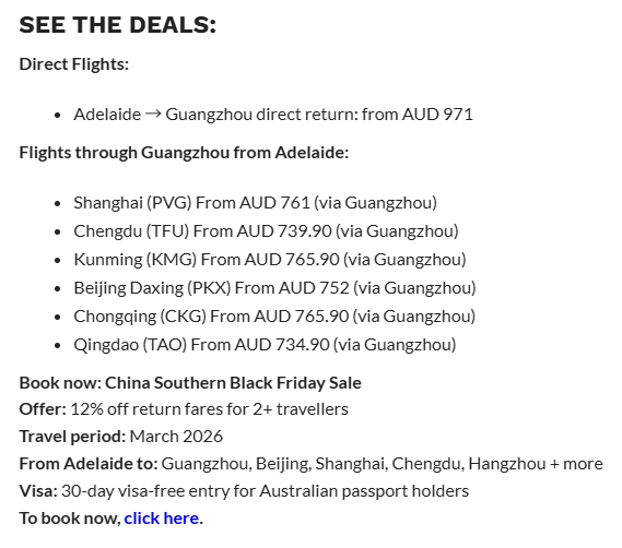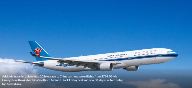 南方航空澳大利亚公司表示,此次优惠为考虑2026年出境游的南澳居民提供了完美时机。"南澳始终是南方航空的重要市场。通过本次黑五促销,我们希望能让阿德旅客在2026年更便捷、更超值地访问中国。"南方航空澳大利亚团队分享道。