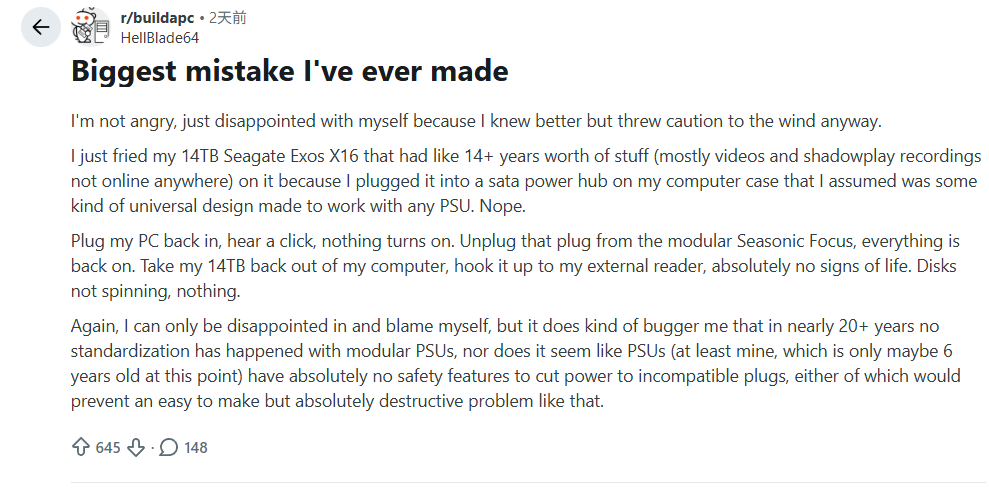 当他重新启动电脑时,只听到一声 “咔哒” 声,电脑随即毫无反应。拔掉硬盘后,电脑恢复正常,但这块14TB硬盘彻底罢工,连接外置读卡器也毫无反应。