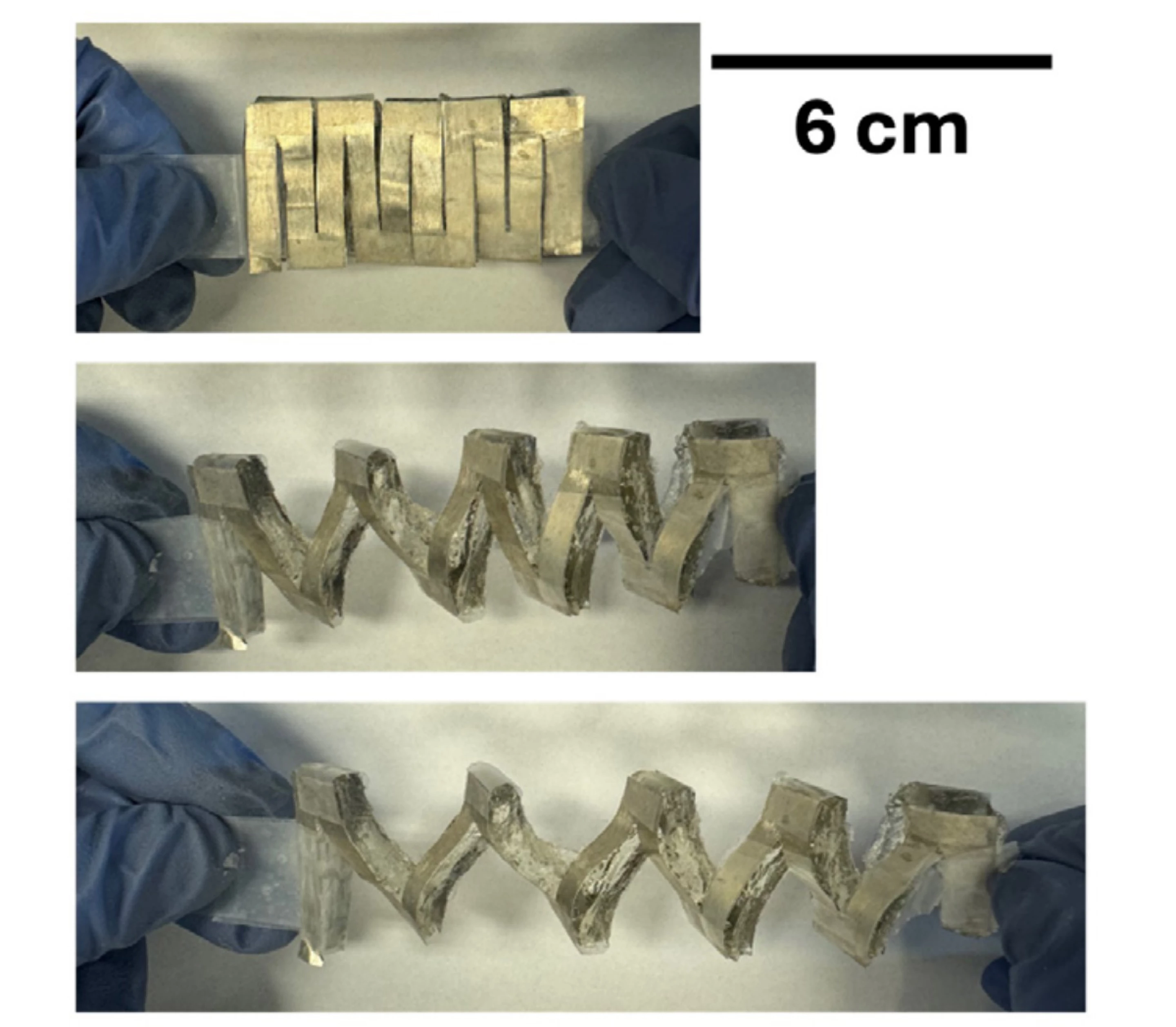 在材料体系确定后,团队进一步借鉴日本“切纸(Kirigami)”艺术,将电池按特定图案切割,使其在拉伸时形成类似三维结构。 这种结构让电池在保持电压稳定的前提下,可以在长度方向上拉伸至原始长度的约180%,从而适应可穿戴设备和体内植入装置对柔性与贴合度的要求。