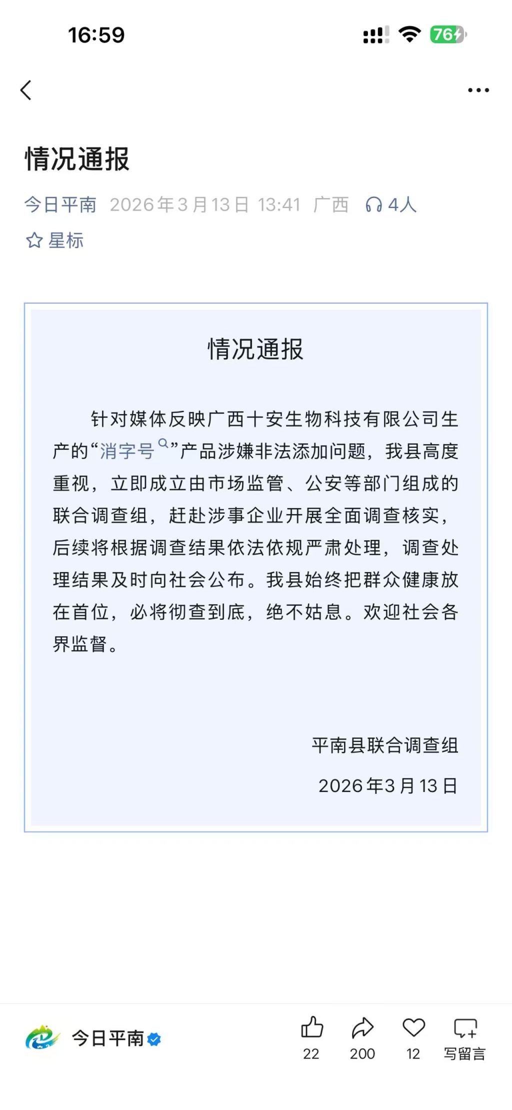 报道发出后引发广泛关注,涉事企业广西十安生物科技有限公司注册地所在的广西平南县发布通报称,当地高度重视,立即成立由市场监管、公安等部门组成的联合调查组,赶赴涉事企业开展全面调查核实,后续将根据调查结果依法依规严肃处理,调查处理结果及时向社会公布。通报中还表示,平南县始终把群众健康放在首位,必将彻查到底,绝不姑息。欢迎社会各界监督。