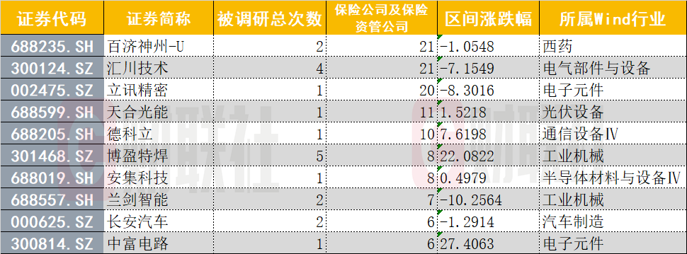 值得注意的是,就险资调研热门个股而言,获得超20家险资调研的百济神州、汇川技术与立讯精密11月以来区间涨幅均为负值。不过,获得8家险资机构调研的博盈特焊,区间涨幅超过22%,获得6家险资机构调研的中富电路区间涨幅则达到27%。两家公司分属于工业机械和电子元件行业。